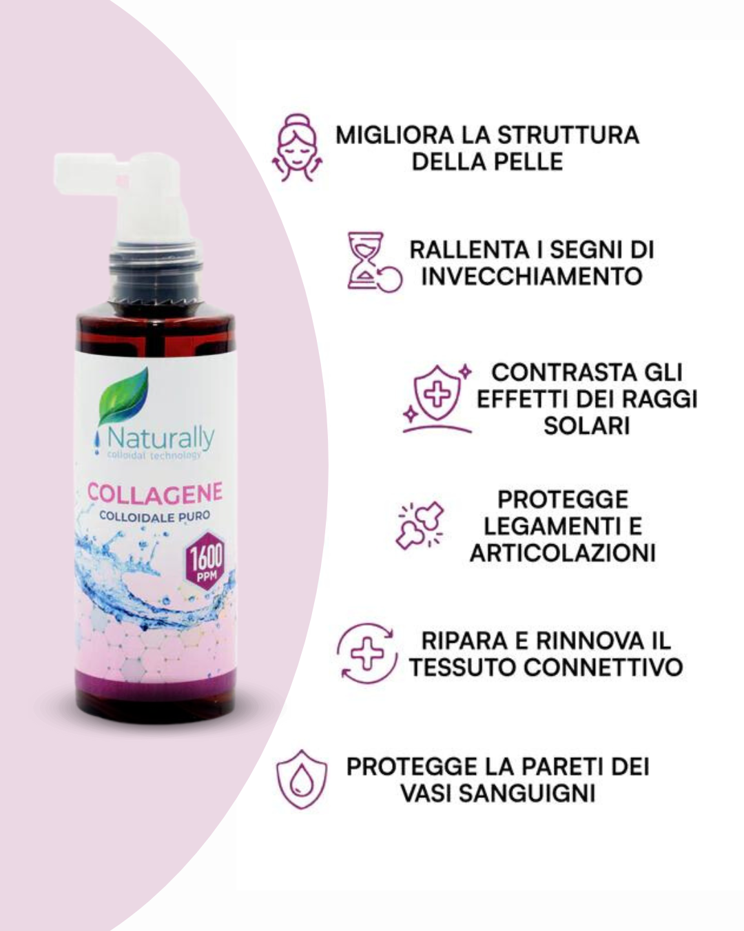 Il Collagene Colloidale Puro Naturally contribuisce a mantenere una pelle tonica, contrastare la formazione di rughe e cellulite, proteggere le articolazioni e le ossa, oltre a prevenire dolori muscolari e articolari.